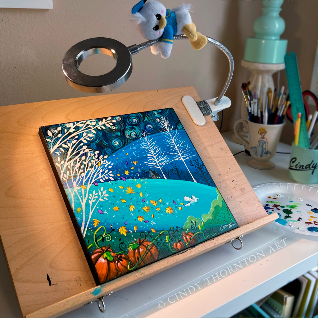 art · autumn · fall · night · painting Country Lights No. 28 October 11, 2022 Cindy Thornton Update: Sold!Original acrylic painting on wood panel, 10x10x.75 inches.I’m offering some small signed prints of this over in my etsy shop here. White owl flying by a pumpkin patching bringing in the fall leaves. Share this: Share on Facebook (Opens in new window) Facebook Share on Pinterest (Opens in new window) Pinterest Share on X (Opens in new window) X Share on Tumblr (Opens in new window) Tumblr Share on Reddit (Opens in new window) Reddit Email a link to a friend (Opens in new window) Email Like Loading... Related Published by Cindy Thornton Illustrative Artist at cindythornton.com View all posts by Cindy Thornton Share this: Share on Facebook (Opens in new window) Facebook Share on Pinterest (Opens in new window) Pinterest Share on X (Opens in new window) X Share on Tumblr (Opens in new window) Tumblr Share on Reddit (Opens in new window) Reddit Email a link to a friend (Opens in new window) Email Like Loading...