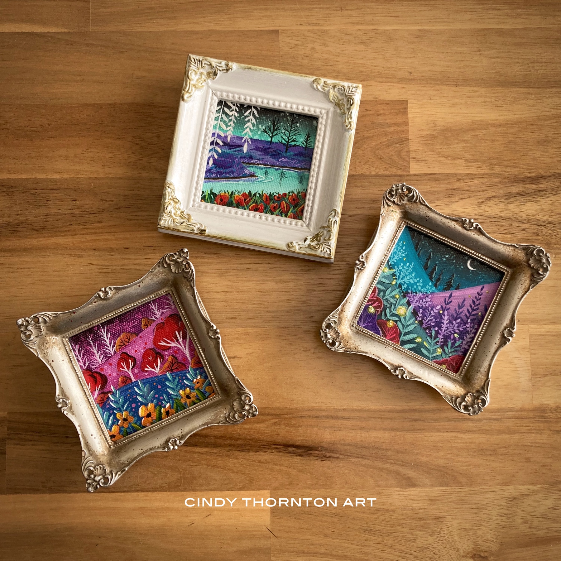 I’m doing some little practice pieces while I work on larger landscapes. I’m also custom framing them so they are ready to hang on a wall. These 3 have sold, but I’m offering them first through my art alerts subscriber list – make sure you are signed up if you want to catch original art! -Cindy
