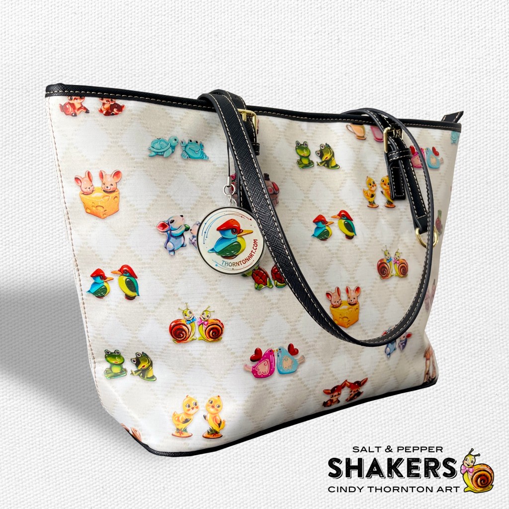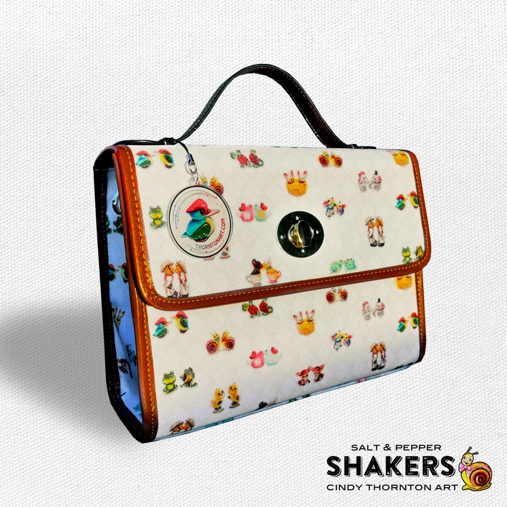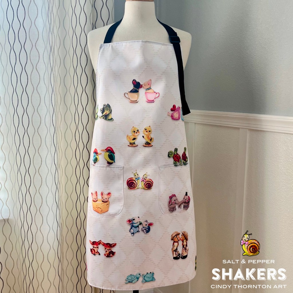 I decided to take my 13 vintage salt and pepper shaker portrait paintings and design a pattern. So much fun, they all look so cute together. Here they are on some handbags and aprons. I had these made for a show, and just posted what I still have on hand up on etsy.