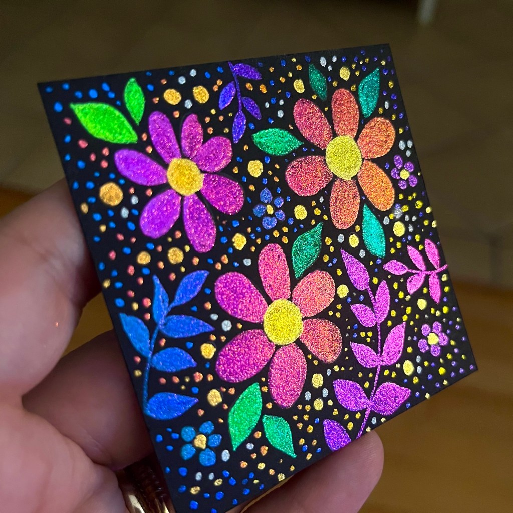 Lastly, here are the 9 mini paintings all together. (each sold separately). Hard to really capture their individual shine in this pic, but each one has it’s own magic and could be seen in the individual videos I posted on the listings on etsy 🙂