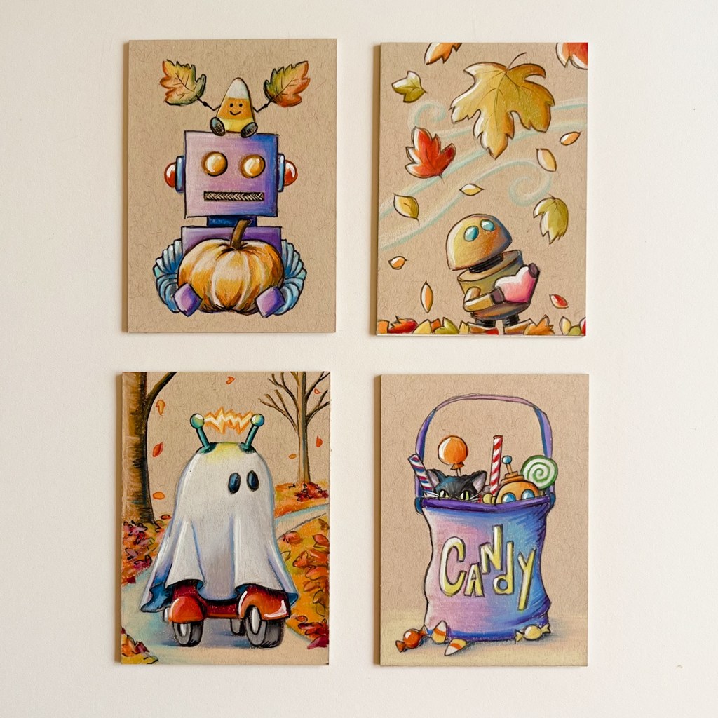 At long last….(I think it’s been over a decade), I’m making ACEO’s again. Never heard of them? I’ll explain. ACEO stands for ‘Art Cards Editions & Originals’. Sometimes they are called ATC’s ‘Artist Trading Cards’. So, collector cards basically, but made by artists. The rules of ACEO’s – 1) they must measure 3.5 x 2.5 inches. 2) They can be any medium (paint, pencil, chalk, pastels, ink, or any other tangible item you can stick to a surface that size). 3) They must be made by the artist.