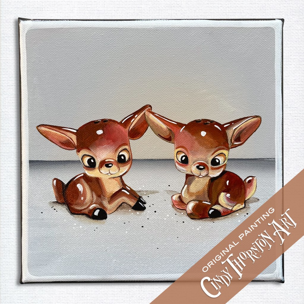 Part of my Shakers series where I find two cute unassuming salt & pepper shakers and celebrate them by painting their portrait. These two wide-eyed porcelain cuties sat especially well for their portrait session 🙂